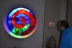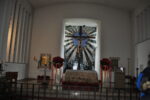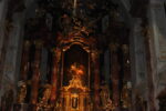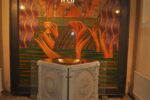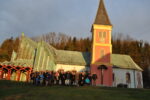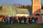 Res smo še ujeli v soncu olepšano cerkev sv. Jakoba, duhovne zvezde, ki se nahaja od filmske zvezde le streljaj daleč, tako rekoč čez travnik in njivo. Pri Arnyju smo se slikali posamično, tukaj pri sv. Jakobu pa je Bernarda, uradna fotografinja romanja, naredila skupinsko fotografijo romarjev. Če smo za prejšnjo cerkev rekli, da je nenavadna, bi lahko to cerkev imenovali: zelo nenavadna. Uradno je cerkev umetniško delo v stilu Dunajske šole fantastičnega realizma. Zasnovo prenove stare cerkve je namreč izvedel umetnik Ernst Fuchs, ki je, nestrokovno rečeno, “pomešal” kovino, plastiko, kamen, les in steklo, v izjemno barvit in razgiban sakralni prostor. Najbolj izstopajo klopi v obliki školjk, ki so razvrščene kot valovi Genezareškega jezera in stekleni oltar podjetja Swarovski. Zanimiva je tudi razsvetljava notranjosti, ki jo za 8 minut sproži kovanec za 2 evra. Nato se zopet vse zatemni in za svetlobo je zopet potrebno v žepu poiskati kakšen evro. Ja, lepoto je treba krepko plačati.