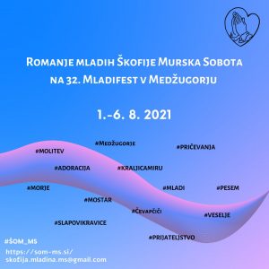 V začetku meseca maja smo se po zgledu Mladifesta v Medžugorju zbirali na 1. Mladinskem festivalu v Murski Soboti, ki je potekal v spletni obliki. Takrat smo v našo škofijo prinesli veselo vest, da je Marija, Kraljica miru vedno z nami in nas čaka odprtih rok. Sedaj pa vas vabimo, da se nam pridružite na romanju v Medžugorje in skupaj z nami doživite milost teh čudovitih krajev. Od 1. do 6. 8. 2021 bomo poromali na že 32. Mladinski festival oz. MLADIFEST v Medžugorju, ki letos poteka pod geslom iz Matejevega evangelija (Mt 19,16): Nekdo je stopil k njemu in rekel: »Učitelj, kaj naj dobrega storim, da prejmem večno življenje?«