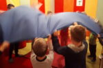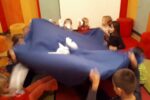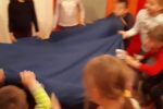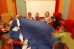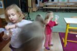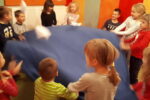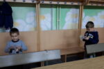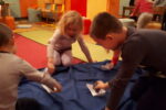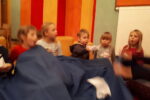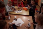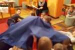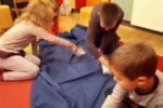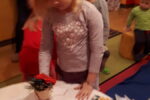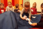 Nato smo se zbrali v krogu, kjer smo kot vedno pripravili oltarček, le namesto sveče, smo danes prižgali svečo na adventnem vencu. Glavni del smo pričeli z molitvijo. Nadaljevali smo z zgodbo iz Svetega pisma – Jezus pomiri vihar. Nato so otroci položili svoje ladjice na modro podlago, ki je predstavljala morje. Uprizorili so vihar. Ob umiritvi viharja smo zapeli pesmico Barčica po morju plava. Otroci so si na ladjice prilepili sliko – Jezus pomiri vihar. Ob koncu uric so se igrali z ladjicami.